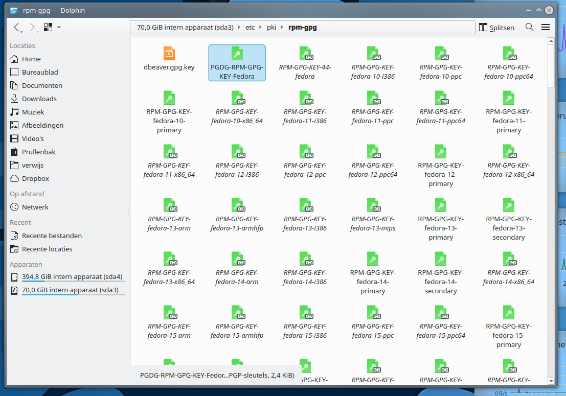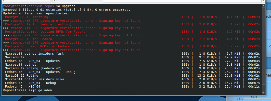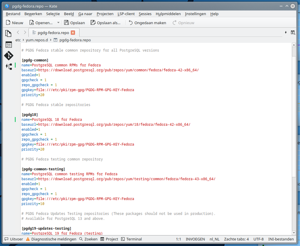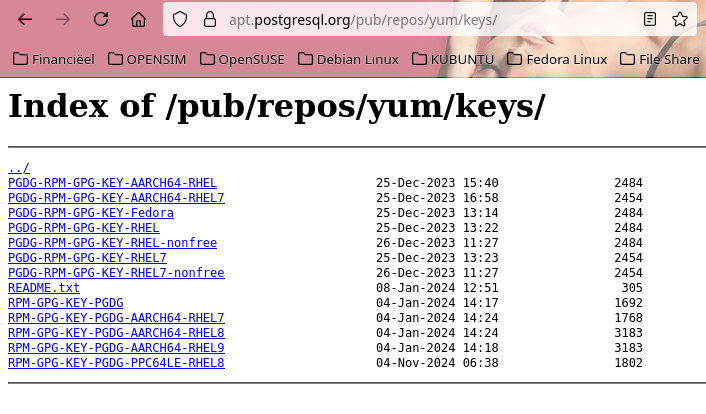Postgresql on Fedora gpg key(s) not working/found i have key installed locally within "/etc/pki/rpm-gpg/" https://i.postimg.cc/cJnrL3BG/PGSQL-key-installed.png I have set key within .repo file: https://i.postimg.cc/DZ3mJzBH/PGSQL-key-set-in-repofile.png I downloaded key from "../pub/repos/yum/keys/" https://i.postimg.cc/8C6jzvmS/PGSQL-key-online.png with "dnf update" i'm getting errors https://i.postimg.cc/zfgVGhF1/PGSQL-key-not-found.png question 1: is this the correct key (witch package are signed with) question 2: if yes, how to correctly use gpg key(s) with pgsql repo -- ____________________________________________________________________ Dank U - Thank You Facebook: http://www.facebook.com/andre.verwijs Instagram: https://instagram.com/dutchglory