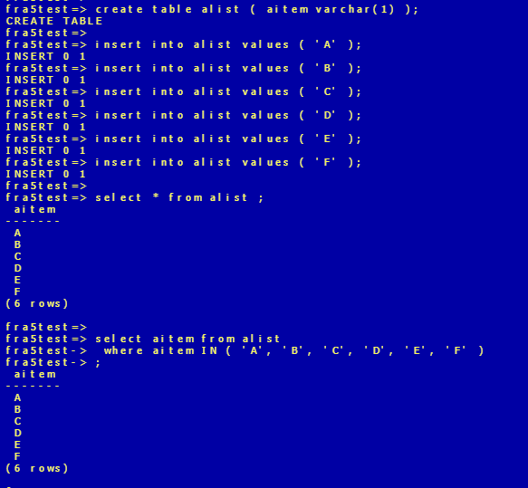 Hi We have noticed a quirk in the IN list operator where the list of values are over several lines , but some have missing comma separators.The command should fail, however it executes only returning certain values. Create table, insert vales, show values , select using IN List First query errors as expected , Second executes with out error! Returning A & F . Details of server . Attached is the sql that I ran Please investigate Many Thanks Ian White Member British Computer Society Oracle & Postgres Database Administrator & Perfomance Expert.Based LondonIan.White@ncratleos.com
