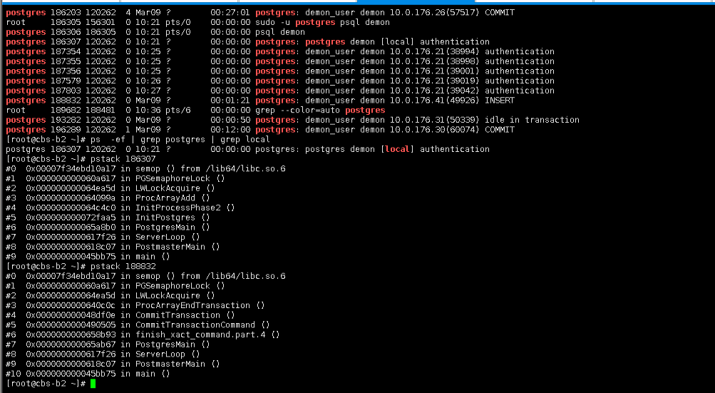 It shows two process's stack, one is pid 186397 who were in authentication, and the other is 188832 who where in INSERT.