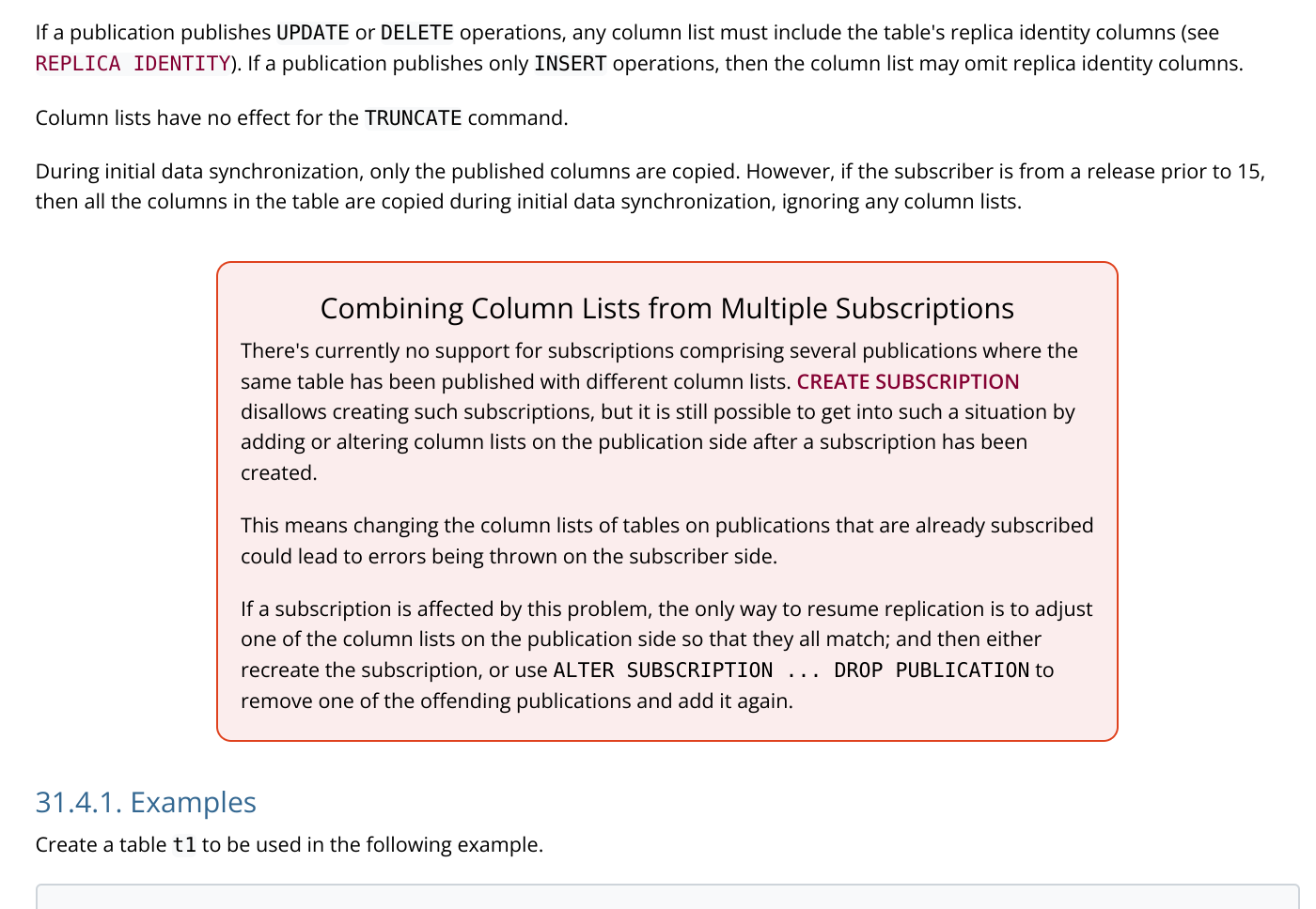 On Mon, Dec 19, 2022 at 10:17 PM Alvaro Herrera <alvherre@alvh.no-ip.org> wrote: > > On 2022-Sep-15, Alvaro Herrera wrote: > > > On 2022-Sep-15, Alvaro Herrera wrote: > > > > > Looking at the rendered docs again, I notice that section "31.4.5. > > > Combining Multiple Column Lists" is *only* the red-tinted Warning block. > > > That seems quite odd. I am tempted to remove the sect2 heading for that > > > one too. > > > > Pushed. I didn't modify this part; I spent too much time looking at it > > trying to figure out how to do it. I think this bit really belongs in > > the CREATE/ALTER docs rather than this chapter. But in order to support > > having a separate <para> for the restriction on combination, we need a > > separate <varlistentry> for the column_name parameter. So I'm going to > > edit that one and I'll throw this change in. > > I figured out how to fix this one -- just remove the <sect2> tags, and > add a <title> tag to the <warning> box. The attached yields the > explanatory text in a separate box that doesn't have the silly > otherwise-empty section title. We add the 'id' that was in the sect2 to > the warning; with this, at the referencing end the full title is > rendered, which looks quite reasonable. I have attached screenshots of > both sides of this. > > Compare the existing > https://www.postgresql.org/docs/15/logical-replication-col-lists.html#LOGICAL-REPLICATION-COL-LIST-COMBINING > - <sect2 id="logical-replication-col-list-combining"> - <title>Combining Multiple Column Lists</title> - - <warning> + <warning id="logical-replication-col-list-combining"> + <title>Combining Column Lists from Multiple Subscriptions</title> Shouldn't the title be "Combining Column Lists from Multiple Publications"? We can define column lists while defining publications so the proposed title doesn't seem to be conveying the right thing. -- With Regards, Amit Kapila.