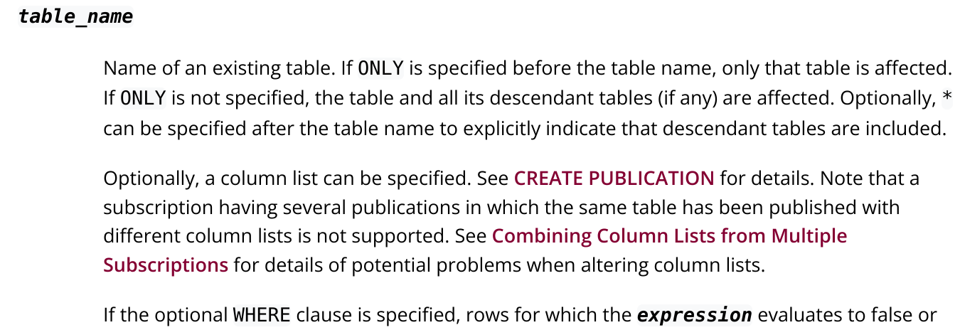 On 2022-Sep-07, Amit Kapila wrote: > Doc: Explain about Column List feature. > > Add a new logical replication section for "Column Lists" (analogous to the > Row Filters page). This explains how the feature can be used and the > caveats in it. > > Author: Peter Smith > Reviewed-by: Shi yu, Vignesh C, Erik Rijkers, Amit Kapila > Backpatch-through: 15, where it was introduced > Discussion: https://postgr.es/m/CAHut+PvOuc9=_4TbASc5=VUqh16UWtFO3GzcKQK_5m1hrW3vqg@mail.gmail.com Hi I just read these docs and noticed that it mentions that column lists can be used for security. As far as I remember, this is wrong: it is the subscriber that builds the query to read column data during initial sync, and the publisher doesn't forbid to read columns not in it, so it is entirely possible for a malicious subscriber to read columns other than those published. I'm pretty sure we discussed this at some point during development of the feature. So I suggest to mention this point explicitly in its own paragraph, to avoid giving a false sense of security. While going over this text I found some additional things that could --in my opinion-- stand some improvement: * It feels better to start the section saying that a list can be specified; subscriber must have all those columns; omitting list means to publish everything. That leads to shorter text (no need to say "you need to have them all, oh wait you might only have a few"). * there's no reason to explain the syntax in vague terms and refer the reader to the reference page. * The first few <sect2> seem to give no useful structure, and instead cause the text to become disorganized. I propose to remove them, and instead mix the paragraphs in them so that we explain the rules and the behavior, and lastly the effect on specific commands. The attached patch effects those changes. One more thing. There's a sect2 about combining column list. Part of it seems pretty judgmental and I see no reason to have it in there; I propose to remove it (it's not in this patch). I think we should just say it doesn't work at present, here's how to work around it, and perhaps even say that we may lift the restriction in the future. The paragraph that starts with "Background:" is IMO out of place, and it repeats the mistake that column lists are for security. Lastly: In the create-publication reference page I think it would be better to reword the Parameters section a bit. It mentions FOR TABLE as a parameter, but the parameter is actually <replaceable>table_name</replaceable>; and the row-filter and column-list explanations are also put in there when they should be in their own <replaceable>expression</> and <replaceable>column_name</> varlistentries. I think splitting things that way would result in a clearer explanation. -- Álvaro Herrera 48°01'N 7°57'E — https://www.EnterpriseDB.com/