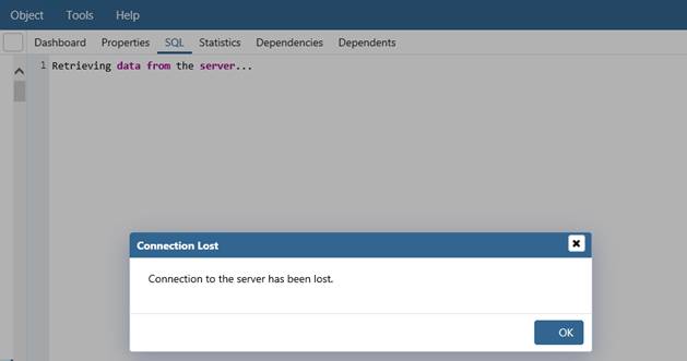 I am trying to generate the DDL of a login role by clicking on the login role in the pgAdmin tool. In pgAdmin 3 it works and generates the DDL, but in pgAdmin 4 It just hangs and you get Connection to the server has been lost. I have a high number of Login/Group Roles (over 700+ login roles) and I would like to get the DDL for any login user I select. I think the query behind the scenes cannot handle the volume of login roles, and it’s similar to a Cartesian product with the query it uses.