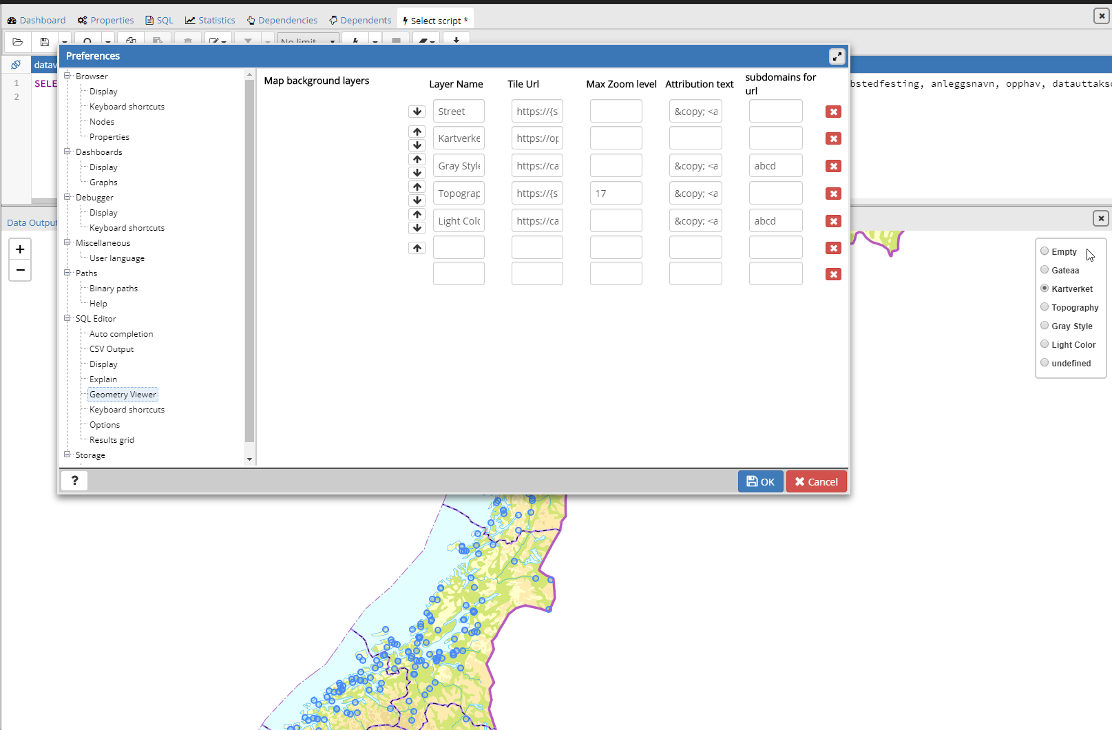 Hello again! I've managed to get closer to resolving this task (see attached image for the current state of the work and https://github.com/atlefren/pgadmin4/tree/mapviewer_custom_layers_3646for code), but I still have some questions. Pleaselet me know if this list isn't the appropriate place. 0. Sorry for breaking the build by introducing a new node version 1. The GeometryViewer now uses browser.get_preferences_for_module to get the available layers at initialization. A bit oftesting suggests that this initialization is perfromed each time the map window is re-opened. Is this correct? Or shouldI listen to some kind of "preferences updated"-event? 2. I've made a new backform-component called "OrderedListControl", which builds a table based on the fields-attribute, inthe same manner as the KeyCodeControl. The control now supports: - editing existing elements - Deleting elements - add a new element - moving existing elements up or down in the list However, I have some challenges: 1. Each time I type in a new value, the render-cycle triggers and the Input looses focus. Any ideas here? My Backbone-skillswas last used 4 years ago, and React has kinda made me forget this stuff. 2. I consider some of the fields optional and some required, but could not find a setting to set the required fields required.Any suggestions? In addition, Design and CSS is not my strong areas, and there are a couple of things I struggle with: 1. I've used buttons for delete and move. This is not pretty, but it works. 2. The last row of the table is always empty and is used for adding a new row. Does this make sense?` 3. Since several of the fields are large the table looks really cramped (and unreadable). In my view, the empty space belowthe label could be used, but I am not sure how I can fix this. Thanks for your replies. -a -- Atle Frenvik Sveen atle@frenviksveen.net 45278689 atlefren.net On Fri, Sep 14, 2018, at 11:43, Atle Frenvik Sveen wrote: > Thanks! > > > Another question: > > I had issues running make install-node using node 10.x. The issue was > related to an old version of the leveldown package > (https://github.com/Level/leveldown/issues/455). > > The dependency on leveldown was introduced by the hard-source-webpack- > plugin, which was required at version 0.4.9. Upgrading hard-source- > webpack-plugin to latest (0.12.0) seems to have solved this problem. > > Are these kinds of fixes something that should be submitted separately, > or can they be included in the final patch? > > -a > > -- > Atle Frenvik Sveen > atle@frenviksveen.net > 45278689 > atlefren.net > > On Fri, Sep 14, 2018, at 09:48, Dave Page wrote: > > Hi > > > > On Fri, Sep 14, 2018 at 8:44 AM, Atle Frenvik Sveen <atle@frenviksveen.net> > > wrote: > > > > > Dave, Khushboo: > > > > > > Thanks for your replies. I've created an issue here: > > > https://redmine.postgresql.org/issues/3646 > > > > > > Please feel free to comment and suggest changes. > > > > > > Thank you both for your input! > > > > > > I guess I will spend some time getting to know this code-base, and when > > > time comes I think I will need some guidance on the process of sending > > > patches etc (as this is not something I am familiar with). > > > > > > I see that there is an .editorconfig and and .eslintrc.js in the repo, > > > along with a .pycodestyle. I've never heard of .pycodestyle, but I am > > > familiar with PEP8. Any pointers on this? > > > > > > > You can run "make check-pep8" and it will check that all the Python code > > conforms. > > > > > > > > > > -a > > > > > > > > > > > > -- > > > Atle Frenvik Sveen > > > atle@frenviksveen.net > > > 45278689 > > > atlefren.net > > > > > > On Fri, Sep 14, 2018, at 05:24, Khushboo Vashi wrote: > > > > On Thu, Sep 13, 2018 at 8:10 PM, Dave Page <dpage@pgadmin.org> wrote: > > > > > > > > > Hi > > > > > > > > > > On Thu, Sep 13, 2018 at 2:50 PM, Atle Frenvik Sveen < > > > atle@frenviksveen.net > > > > > > wrote: > > > > > > > > > >> Hi list! > > > > >> > > > > >> The new Mapview is great, but when you give people something they > > > always > > > > >> want more, and so do I. > > > > >> > > > > >> I want to be able to add custom background layers to the existing > > > list of > > > > >> layers. > > > > >> > > > > >> I'm thinking that the list of layers should be configurable from the > > > > >> Preferences -> Sql editor menu (or somewhere in the Preferences) > > > > >> > > > > >> Then again, given that I know both Js, Leaflet, Backbone, and > > > > >> Python/Flask I guess I should contribute the changes myself rather > > > then > > > > >> waiting for someone else to do this. > > > > >> > > > > > > > > > > Cool :-) > > > > > > > > > > > > > > >> > > > > >> However, I have some questions before I jump right on this task: > > > > >> > > > > >> First some organizational: > > > > >> 1. If I add this, is this something that is welcomed by the project? > > > > >> > > > > > > > > > > Yes! > > > > > > > > > > > > > > >> 2. How do I register a task on https://redmine.postgresql.org > > > > >> /projects/pgadmin4/issues > > > > >> > > > > > > > > > > Assuming you have a user account on there, there's a "New Issue" button > > > > > towards the top right. > > > > > > > > > > > > > > >> 3. Is it ok to clone the GitHub mirror and submit a PR there? > > > > >> > > > > > > > > > > You're welcome to work in a GitHub mirror of course, but please send > > > > > patches here - we won't see GitHub PRs as our primary repo is > > > > > git.postgresql.org. > > > > > > > > > > > > > > >> > > > > >> Then some tech-related questions: > > > > >> > > > > >> 1. It seems like window.top.pgAdmin.Browser. > > > get_preferences_for_module > > > > >> is used for getting preferences from js, and that the > > > PreferencesModule > > > > >> python class is responsible for managing preferences. But where are > > > the > > > > >> default preferences listed? > > > > >> > > > > > > > > > > You'll find register_preferences functions in some of the Python > > > modules > > > 