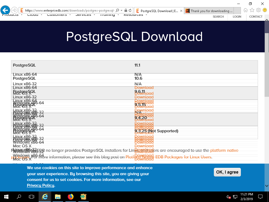 My configuration is Windows Server 2016 with Internet Explorer 11. (This is available on your favorite cloud provider.) https://www.enterprisedb.com/downloads/postgres-postgresql-downloads looks jumbled, with much text overlapping other text; see attached screenshot. Since https://www.postgresql.org/download/windows/ links to this page, I think it should function under Internet Explorer. (I see the IE problem reported in https://postgr.es/m/flat/20171201034800.GA3219179@rfd.leadboat.com no longer appears. Thanks for fixing that one.)