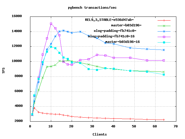 Now that I've had a little break from the big XLogInsert scaling patch, I went back to do some testing and profiling of it. I saw a lot of contention on the first access of RedoRecPtr and force/fullPageWrites, which made me realize that I put those variables right next to the heavily-contended insertpos_lck spinlock and the variables that it protects. Needless to say, that's a recipe for contention. I added some padding between those two, per attached patch, and got a big improvement. So we should definitely do that. I just added a char[128] field between them, which is enough to put them on different cache lines on the server I'm testing on. I don't think there is any platform-independent way to get the current cache line size, unfortunately. Since this doesn't affect correctness, I'm inclined to just add the 128-byte padding field there. Attached is a graph generated by pgbench-tools. Full results are available here: http://hlinnaka.iki.fi/xloginsert-scaling/padding/. The test query used was: insert into foo:client_id select generate_series(1, 100); That is, each client inserts a lot of rows into a different table. The table has no indexes. This is pretty much the worst-case scenario for stressing XLogInsert. The "master-b03d196" is unpatched git master, "xlog-padding-fb741c0" is with the padding. The -16 plots are the same, but with xloginsert_slots=16 (the default is 8). The server has 16 cores, 32 with hyperthreading. It's interesting that although the peak performance is better with 8 slots than with 16, it doesn't scale as gracefully with 16 slots. I believe that's because with more insertion slots, you have more backends fighting over the insertpos_lck. With fewer slots, the extra work is queued behind the insertion slots instead, and sleeping is better than spinning. In either case, the performance with the padding is better than without. - Heikki