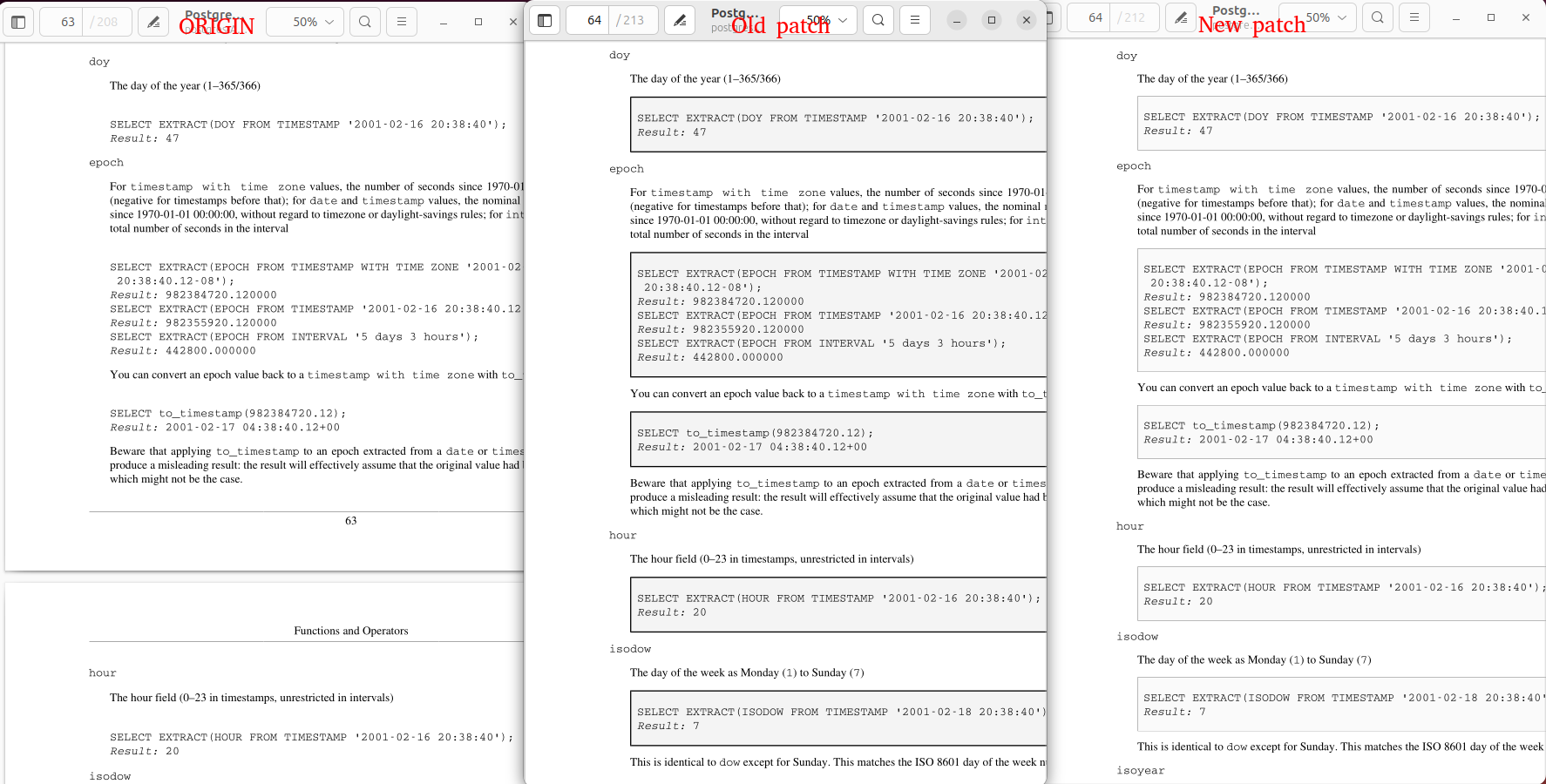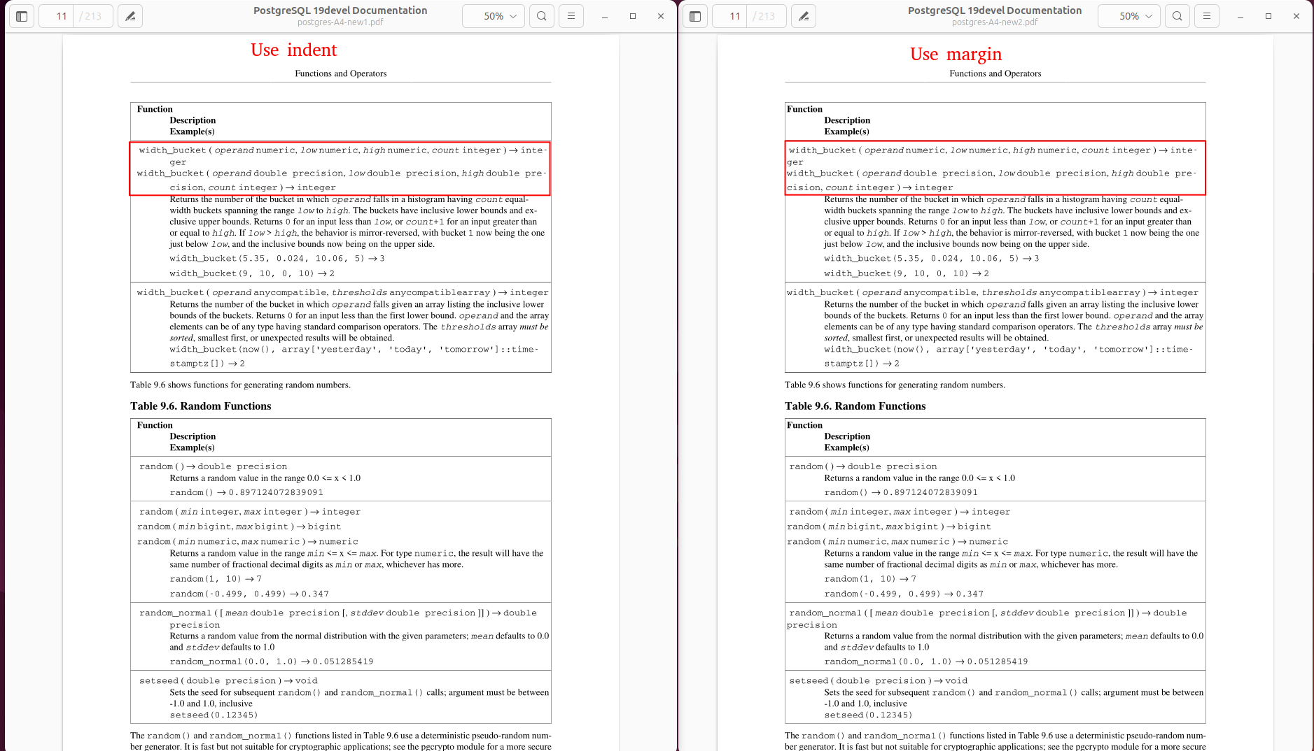 Thank you for reviewing the patch. > > 3. **Replaced `text-indent` with `margin-left` for `func_signature` and > > `column_definition`**: > > - The previous `text-indent: -3.5em` only affected the first line, causing > > inconsistent formatting for multi-line code blocks. Changing this to > > `margin-left: 0em` ensures consistent alignment across all lines. > > I think I found what this is meant to change, but it's not clear why one > is better than the other. I think you would need to provide some > concrete examples with screenshots perhaps that people could look at. For the change to margin-left, I have attached a screenshot for comparison. (pdf-table-margin.png) Currently, when the Function/Operator content is too long, it wraps like this: ``` Function/Operator Description function(....) -> Function continued... Description ``` With the margin-left change, it will look like this: ``` Function/Operator Description function(....) -> function continued... Description ``` This way, the continuation of the function/operator starts from the same position as the first line, making it easier to distinguish from the Description. > > 4. **Introduced `shade.verbatim.style`**: > > - Added a shaded background for code blocks to improve visual distinction. > > This includes a border, padding, and a light gray background color > > (`#EFEFEF`). > > - Adjusted padding to reduce excessive spacing above code blocks. > > I'm not a fan of this change. The boxes break the flow of the text. > > I think it's ok to put boxes and shading around elements that are not in > the flow of the text, like the warning boxes, are perhaps tables or > formal examples. But not verbatim text that is part of the main text. Regarding the background color for code blocks , the HTML version of the documentation already uses a background color for code blocks, and I think this makes them easier to read. If the current color feels too strong, perhaps we could use a lighter shade to reduce the emphasis while still improving readability. To demonstrate this, I have created a patch (`0004-pdf-shade.patch`) that adjusts the shading for code blocks in the PDF output. I have also attached a comparison image (`pdf-shade.png`) to illustrate the effect. Please let me know your thoughts or if you have any suggestions for further adjustments.