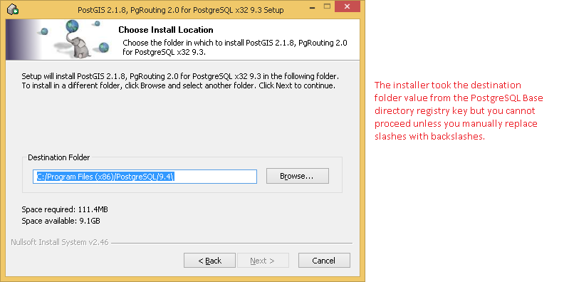 The user of slashes instead of backslathes in the Base Directory key cause an issue when installing PostG