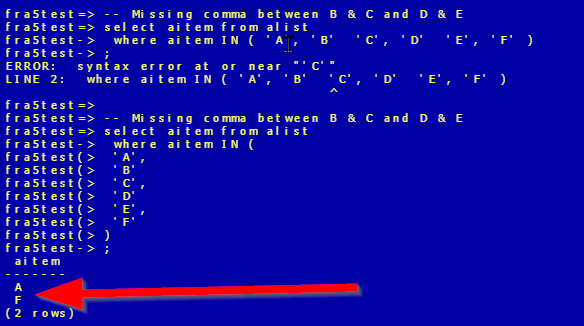 Hi We have noticed a quirk in the IN list operator where the list of values are over several lines , but some have missing comma separators.The command should fail, however it executes only returning certain values. Create table, insert vales, show values , select using IN List First query errors as expected , Second executes with out error! Returning A & F . Details of server . Attached is the sql that I ran Please investigate Many Thanks Ian White Member British Computer Society Oracle & Postgres Database Administrator & Perfomance Expert.Based LondonIan.White@ncratleos.com
