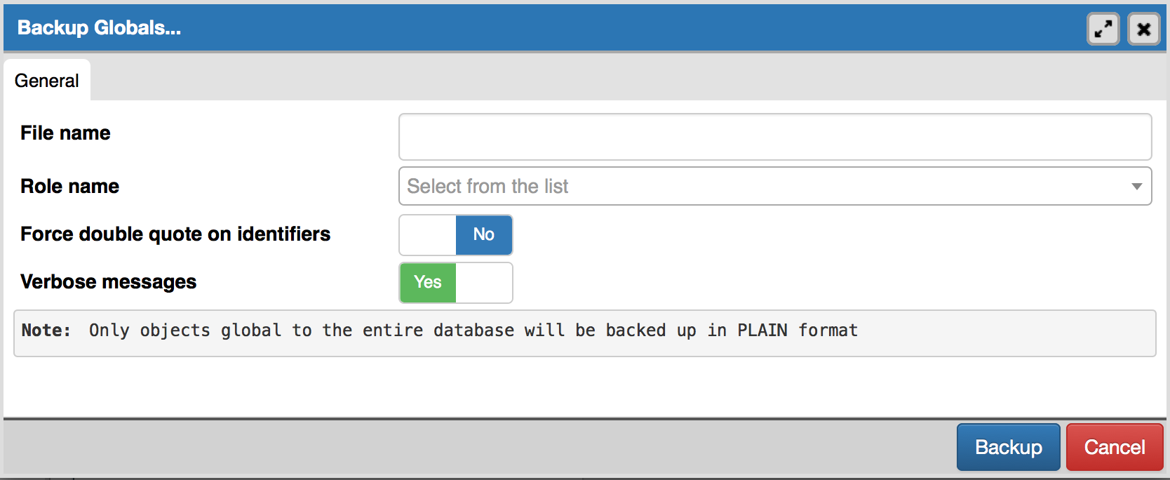 id: 'server_note', label: '{{ _('Note') }}',text: '{{ _('The backup format will be PLAIN') }}',type: 'note'