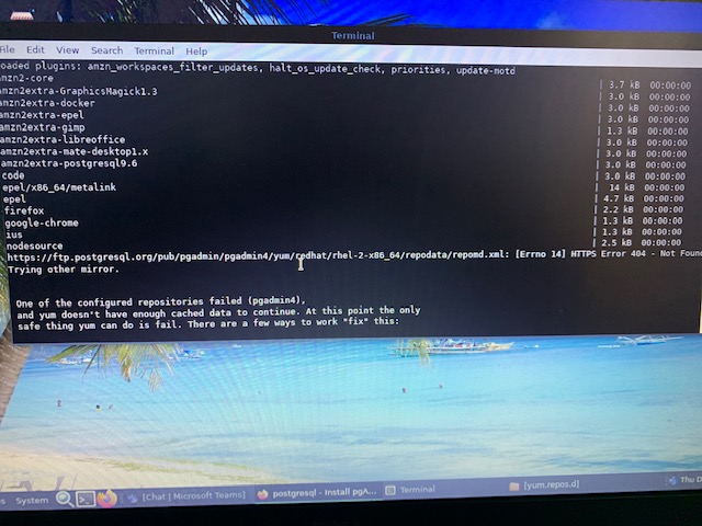 Adding a screenshot. Sorry for the camera pic but for reasons I’m not going to go into right now it is difficult to send a screenshot.Sent from my iPhoneOn Dec 16, 2021, at 9:48 AM, enderjsv Hurd <enderjsv@hotmail.com> wrote:Hello. I’m trying to install pgadmin4 on a Linux workspace. The official site for instructions is here. https://na01.safelinks.protection.outlook.com/?url=https%3A%2F%2Fwww.pgadmin.org%2Fdownload%2Fpgadmin-4-rpm%2F&data=04%7C01%7C%7Cbaef5612fe604e21502408d9c0bc3475%7C84df9e7fe9f640afb435aaaaaaaaaaaa%7C1%7C0%7C637752736836864916%7CUnknown%7CTWFpbGZsb3d8eyJWIjoiMC4wLjAwMDAiLCJQIjoiV2luMzIiLCJBTiI6Ik1haWwiLCJXVCI6Mn0%3D%7C3000&sdata=KABab3fNQ%2FC5i7tGFuSdzEYRodvftroFUVwRvAkfDl4%3D&reserved=0