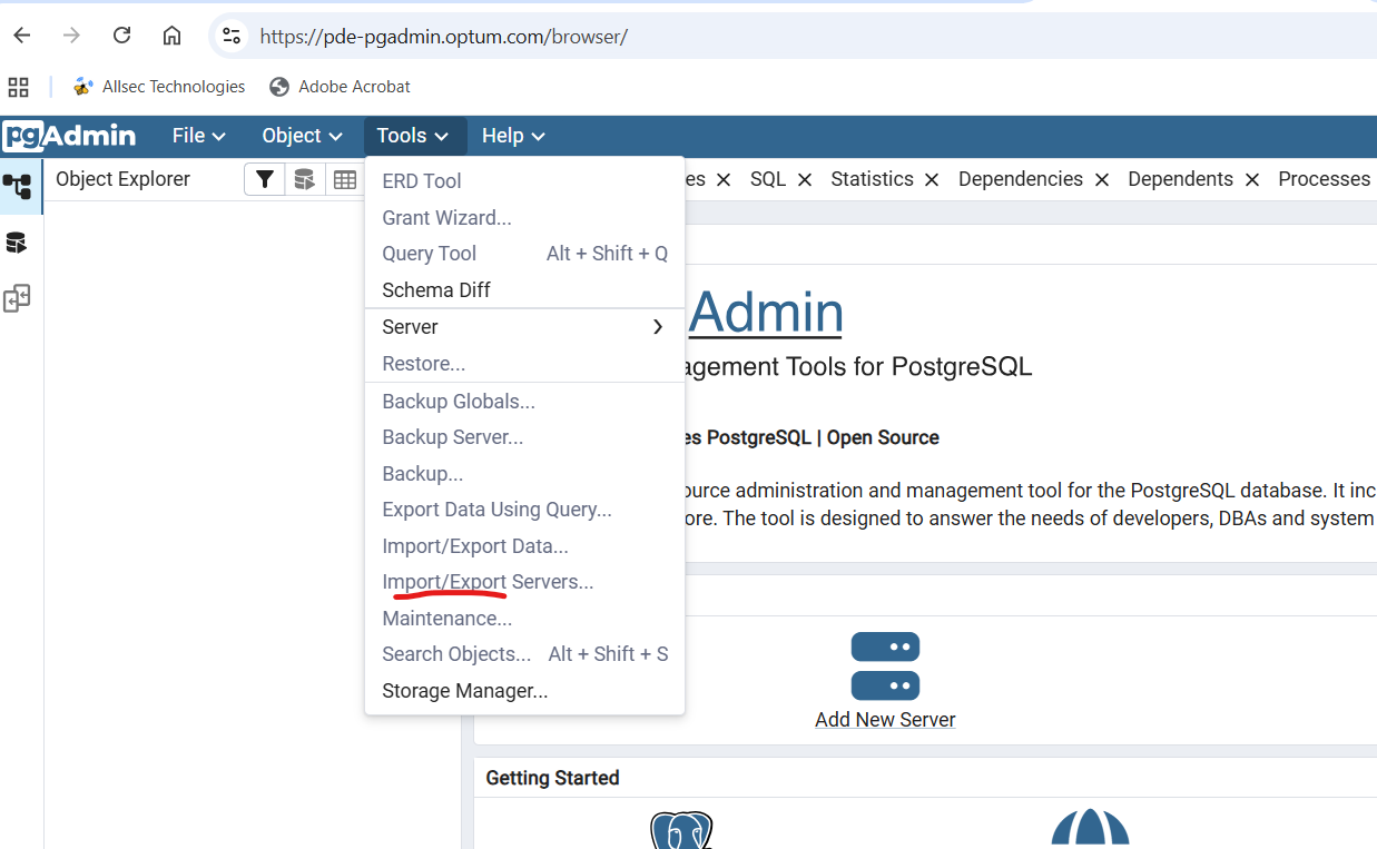 In pgadmin we see Import/export servers option is disabled.could you please let us know how can we make it enabled?