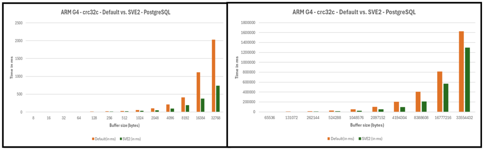 We used the CRC32C microbenchmark SQL function published on the PostgreSQL mailing list [0] to evaluate the performance of the SVE2 implementation against the existing scalar ARM version across multiple buffer sizes.