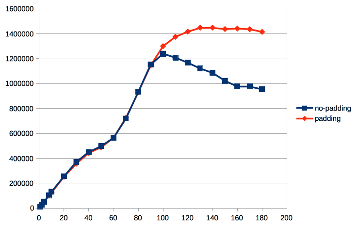 On high number of clients padding gives very significant benefit. However, on low number of clients there is small regression. I think this regression could be caused by alignment of other data structures.