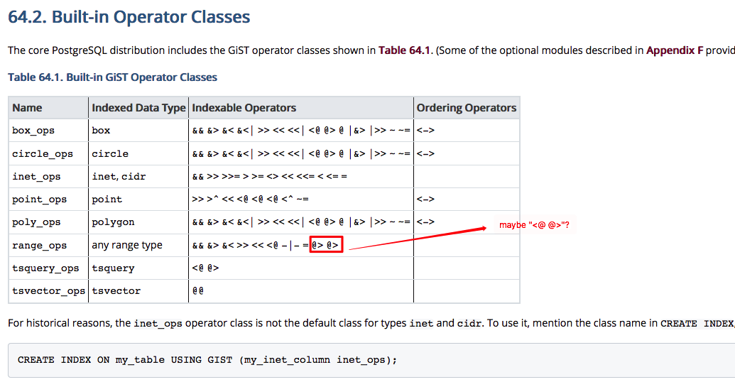 hi all:In Document "Table 59-1. Built-in GiST Operator Classes":"range_ops any range type && &> &< >> << <@ -|- = @> @>", exist double "@>",Should be "<@ @>" ?