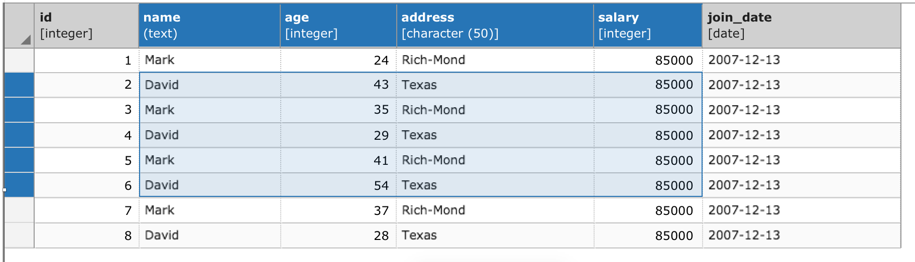 open query tool and see resultsselect columns and rowsRight click on tables in browser > view all dataRight click on tables in browser > view all data, select columns and rows3. differentiating header text so that field name is bold and datatype is in bracketsNot sure about the brackets - for example, it might look weird with array types, e.g.[character varying(50)[]]Given that the column name is in bold, and the type isn't, perhaps the brackets should be omitted?Oh good point. It seems like there are a few datatypes that require brackets. I think having font size for datatypes be slightly smaller than field name also works in establishing some visual hierarchy within the text.Just a note about the screens with highlighting - the selection implies that using the shift (or command or control) key to select a group of cells will work. This keyboard shortcut does not exist now, but is future work. The screens are done that way to show what highlighted columns and rows would look like.--Dave Page