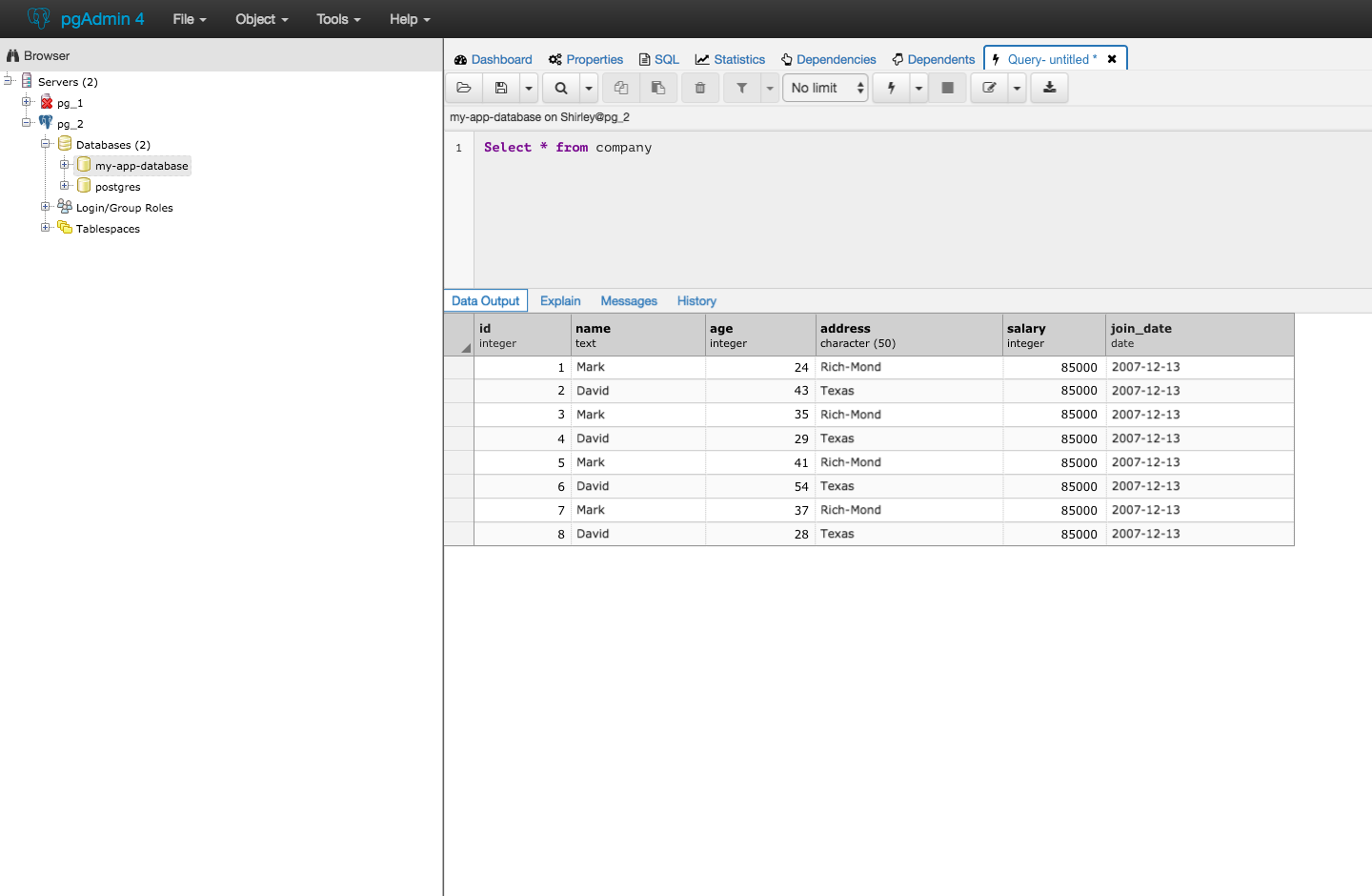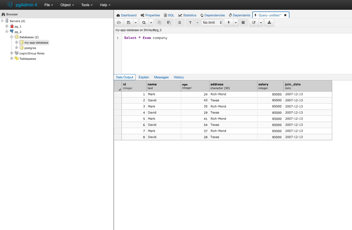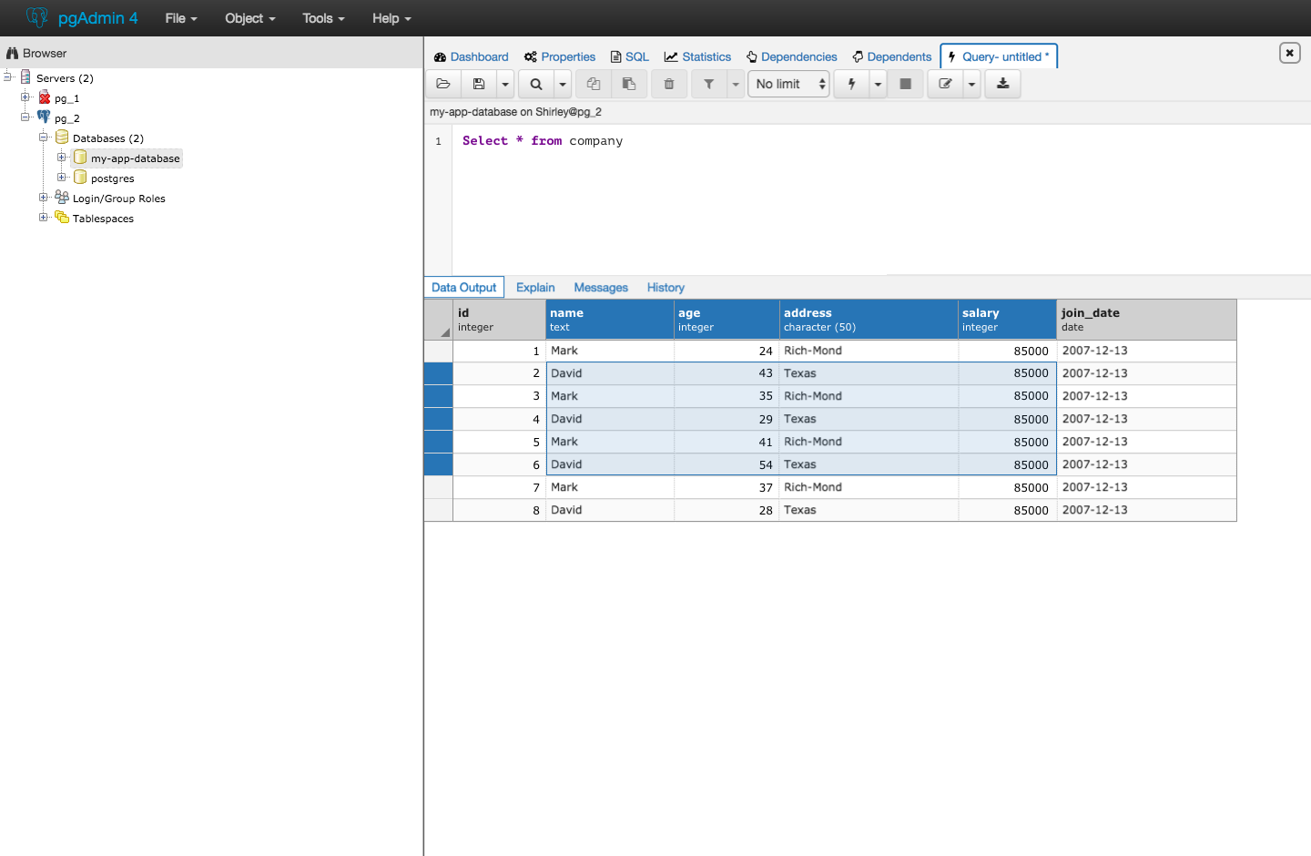 On Wed, Apr 12, 2017 at 9:02 PM, Shirley Wang <swang@pivotal.io> wrote:On Wed, Apr 12, 2017 at 11:26 AM Dave Page <dpage@pgadmin.org> wrote:HiOn Wed, Apr 12, 2017 at 4:20 PM, Shirley Wang <swang@pivotal.io> wrote:Hello!Our team is starting to work on changes to the results table, including:1. changing unselected columns and row colors to greyI'd like to see the entire window to see if that seems to make things too flat, but no objection to a colour change in principal.We're still working on styling the top navigation and also the bar with data output, explain, messages, and history, but here's what it looks like now with the current navigation styling. Because styles for the results table isn't impacting other modules or dialogs (exception being 'view data' options), we can come to a conclusion about styling for the table first, and take the results table into consideration when it comes to styling other parts of the editor.I think that the table styling patch can be merged independently from top navigation styles (this way we're not held up by design and we can release and gather feedback on the results table).Sure.Here's what it would look like with the current navigation in pgAdmin4.Is that a new shade of gray? How many do we have now? It looks to me like it's starting to get messy, with too many different variations of gray plus the light blues used for the codemirror gutter and alternate rows in the grid.