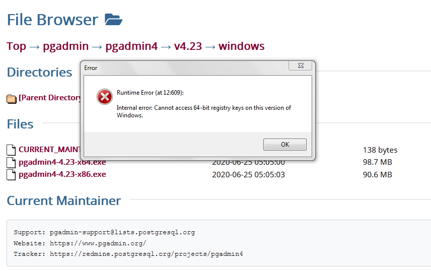 I am running Windows 7, SP1, 32-bit, and I get an error message when I try to install pgadmin4 x86.exe or x64.exe that says the system "cannot access 64-bit registry keys". Pgadmin is supposed to be available for Windows 7, according to this page on your website: