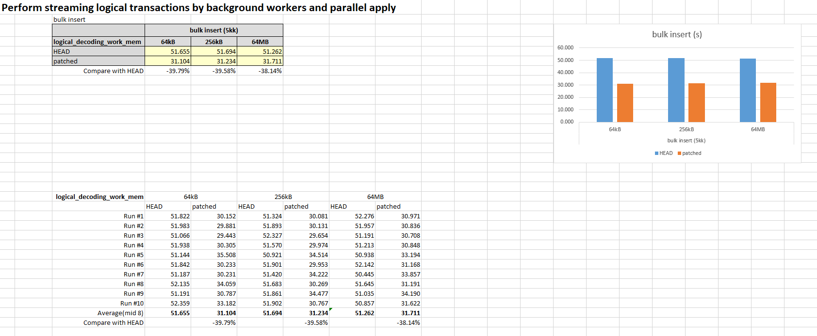 On Wednesday, April 6, 2022 1:20 PM Amit Kapila <amit.kapila16@gmail.com> wrote: > In this email, I would like to discuss allowing streaming logical > transactions (large in-progress transactions) by background workers > and parallel apply in general. The goal of this work is to improve the > performance of the apply work in logical replication. > > Currently, for large transactions, the publisher sends the data in > multiple streams (changes divided into chunks depending upon > logical_decoding_work_mem), and then on the subscriber-side, the apply > worker writes the changes into temporary files and once it receives > the commit, it read from the file and apply the entire transaction. To > improve the performance of such transactions, we can instead allow > them to be applied via background workers. There could be multiple > ways to achieve this: > > Approach-1: Assign a new bgworker (if available) as soon as the xact's > first stream came and the main apply worker will send changes to this > new worker via shared memory. We keep this worker assigned till the > transaction commit came and also wait for the worker to finish at > commit. This preserves commit ordering and avoid writing to and > reading from file in most cases. We still need to spill if there is no > worker available. We also need to allow stream_stop to complete by the > background worker to finish it to avoid deadlocks because T-1's > current stream of changes can update rows in conflicting order with > T-2's next stream of changes. > Attach the POC patch for the Approach-1 of "Perform streaming logical transactions by background workers". The patch is still a WIP patch as there are serval TODO items left, including: * error handling for bgworker * support for SKIP the transaction in bgworker * handle the case when there is no more worker available (might need spill the data to the temp file in this case) * some potential bugs The original patch is borrowed from an old thread[1] and was rebased and extended/cleaned by me. Comments and suggestions are welcome. [1] https://www.postgresql.org/message-id/8eda5118-2dd0-79a1-4fe9-eec7e334de17%40postgrespro.ru Here are some performance results of the patch shared by Shi Yu off-list. The performance was tested by varying logical_decoding_work_mem, which include two cases: 1) bulk insert. 2) create savepoint and rollback to savepoint. I used synchronous logical replication in the test, compared SQL execution times before and after applying the patch. The results are as follows. The bar charts and the details of the test are Attached as well. RESULT - bulk insert (5kk) ---------------------------------- logical_decoding_work_mem 64kB 128kB 256kB 512kB 1MB 2MB 4MB 8MB 16MB 32MB 64MB HEAD 51.673 51.199 51.166 50.259 52.898 50.651 51.156 51.210 50.678 51.256 51.138 patched 36.198 35.123 34.223 29.198 28.712 29.090 29.709 29.408 34.367 34.716 35.439 RESULT - rollback to savepoint (600k) ---------------------------------- logical_decoding_work_mem 64kB 128kB 256kB 512kB 1MB 2MB 4MB 8MB 16MB 32MB 64MB HEAD 31.101 31.087 30.931 31.015 30.920 31.109 30.863 31.008 30.875 30.775 29.903 patched 28.115 28.487 27.804 28.175 27.734 29.047 28.279 27.909 28.277 27.345 28.375 Summary: 1) bulk insert For different logical_decoding_work_mem size, it takes about 30% ~ 45% less time, which looks good to me. After applying this patch, it seems that the performance is better when logical_decoding_work_mem is between 512kB and 8MB. 2) rollback to savepoint There is an improvement of about 5% ~ 10% after applying this patch. In this case, the patch spend less time handling the part that is not rolled back, because it saves the time writing the changes into a temporary file and reading the file. And for the part that is rolled back, it would spend more time than HEAD, because it takes more time to write to filesystem and rollback than writing a temporary file and truncating the file. Overall, the results looks good. Best regards, Hou zj